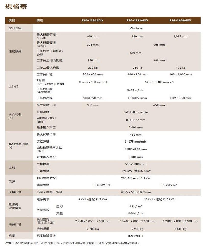 • 產(chǎn)品描述:福裕FSG-1632ADIV多年精心研究的技術(shù)結(jié)晶,福裕大水磨床外型穩(wěn)固、結(jié)構(gòu)剛強(qiáng),各操作把手及活動(dòng)式操作盤均於操作者優(yōu)良的視線範(fàn)圍內(nèi),福裕磨床配合人體工學(xué)設(shè)計(jì),提供您更高的工作效率。AC伺服馬達(dá)升降傳動(dòng),扭力大、速度快、定位精度高,配合全自動(dòng)控制系統(tǒng),進(jìn)給精度可達(dá)0.0001" (0.001mm)。 負(fù)載力檢知功能:可觀測磨削時(shí)的負(fù)載力,主動(dòng)告知修砂時(shí)機(jī),主動(dòng)修砂,使機(jī)臺(tái)智慧化。 動(dòng)平衡校正